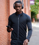 95% recycled polyester/5% elastane. Drop shoulder style with forward facing seams. Full length zip with chin guard and inner zip guard. Open cuffs and hem. Contrast cover stitching.